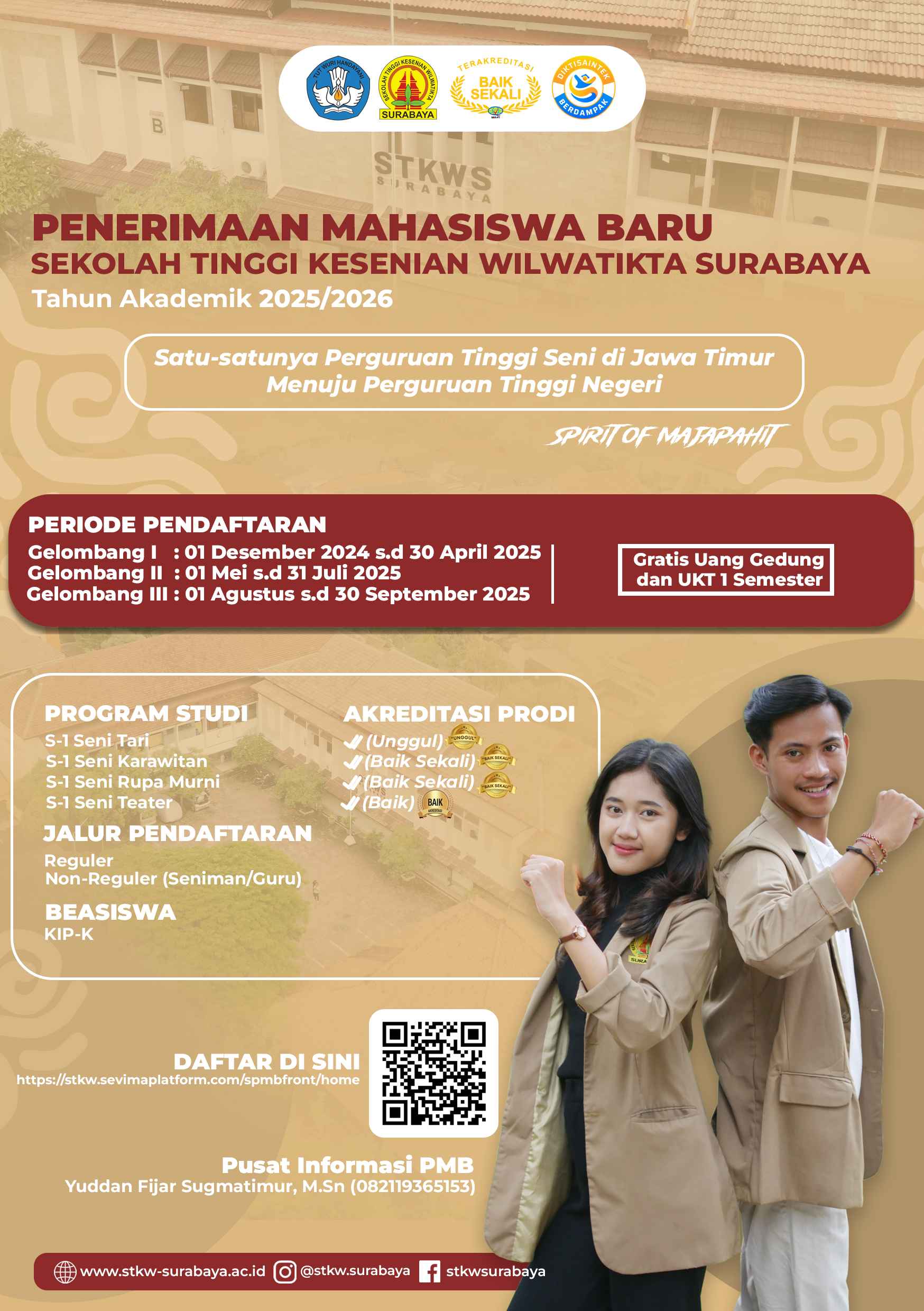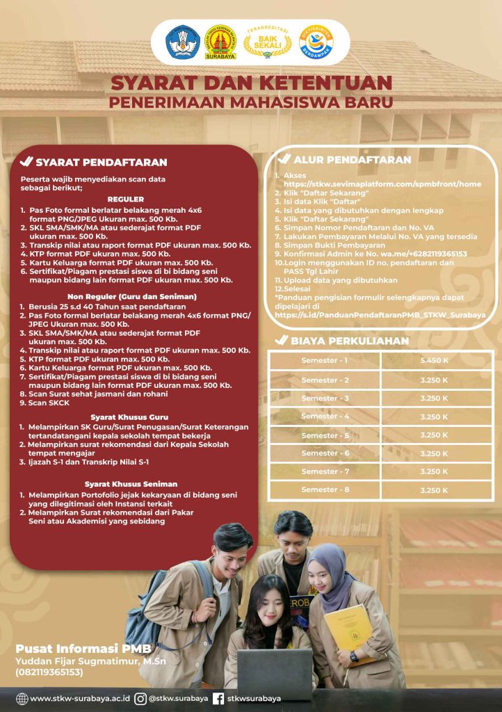 Selamat datang di Sekolah Tinggi Kesenian Wilwatikta (STKW) Surabaya β satu-satunya Perguruan Tinggi Seni di Jawa Timur yang sedang menuju status Perguruan Tinggi Negeri. Kami mengundang putra-putri terbaik bangsa yang memiliki semangat, bakat, dan cinta terhadap seni untuk bergabung bersama kami di Tahun Akademik 2025/2026.